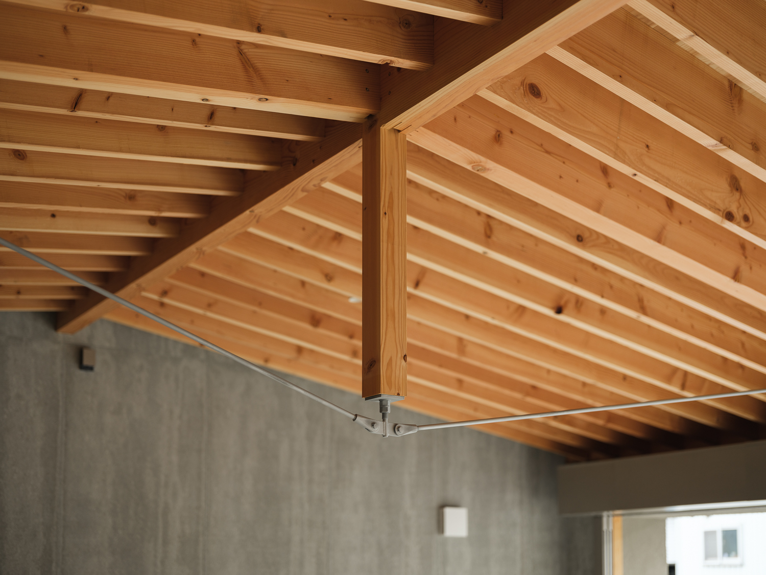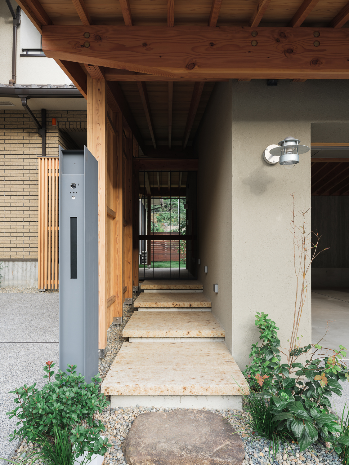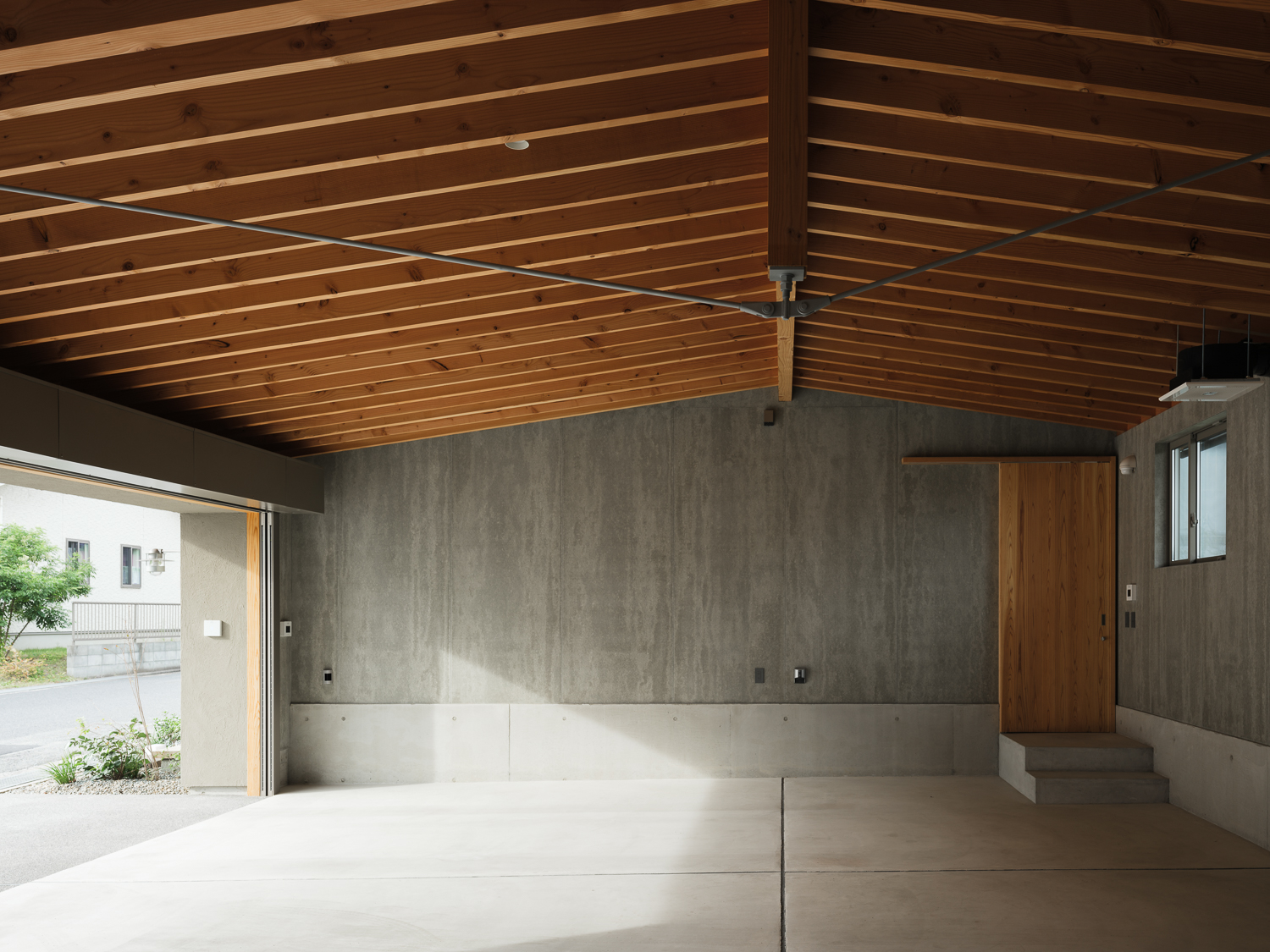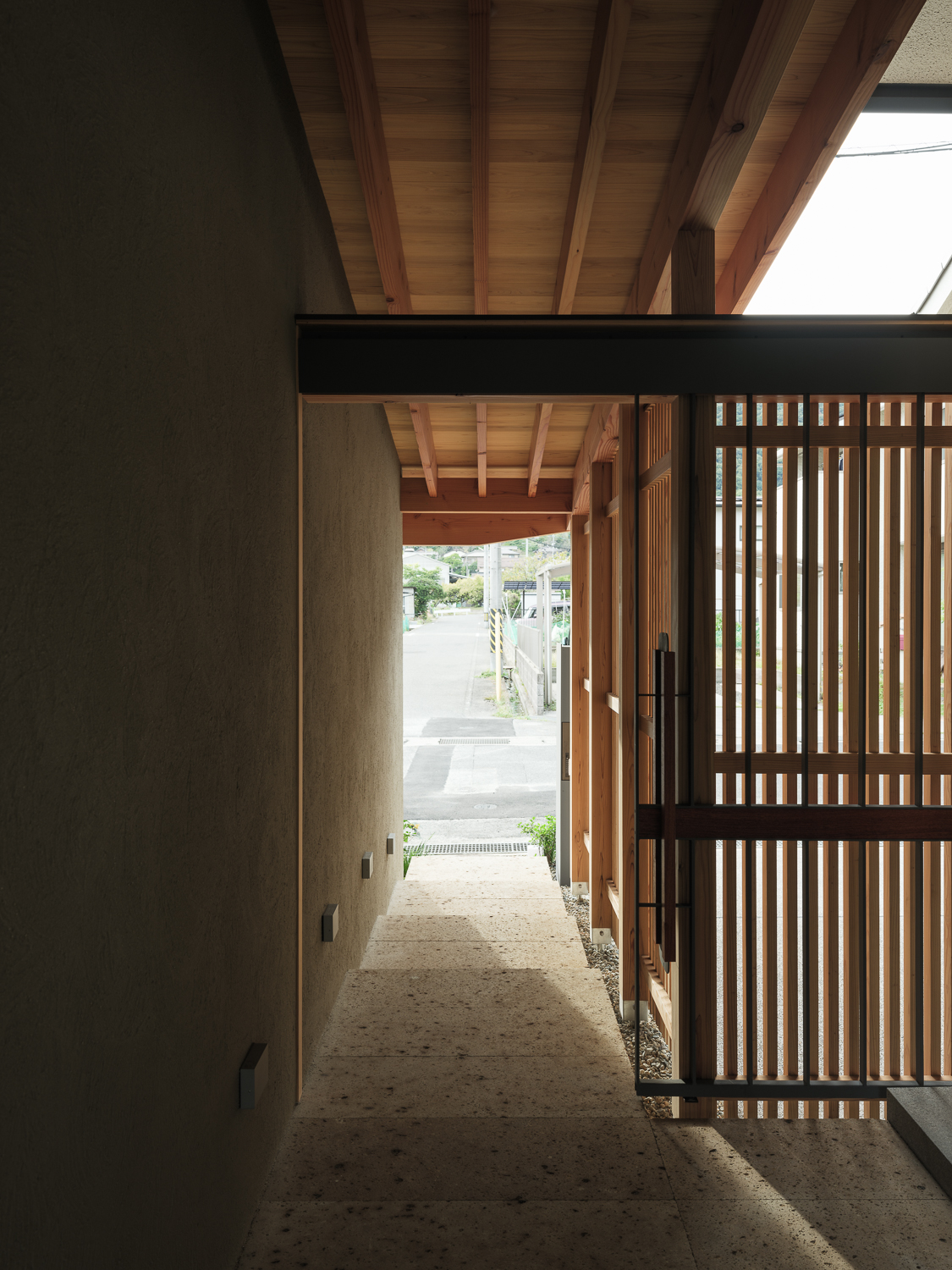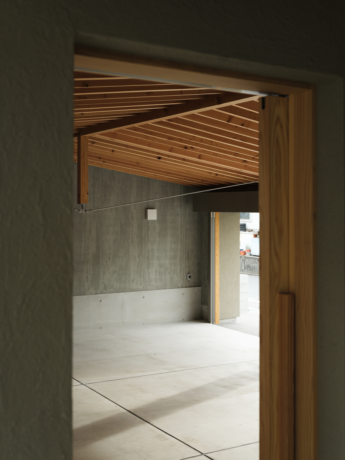 木の柔らかさと大谷石の重なりが空間に静けさを与え、天井にあらわした化粧垂木が素材の陰影をやわらかく描き出す